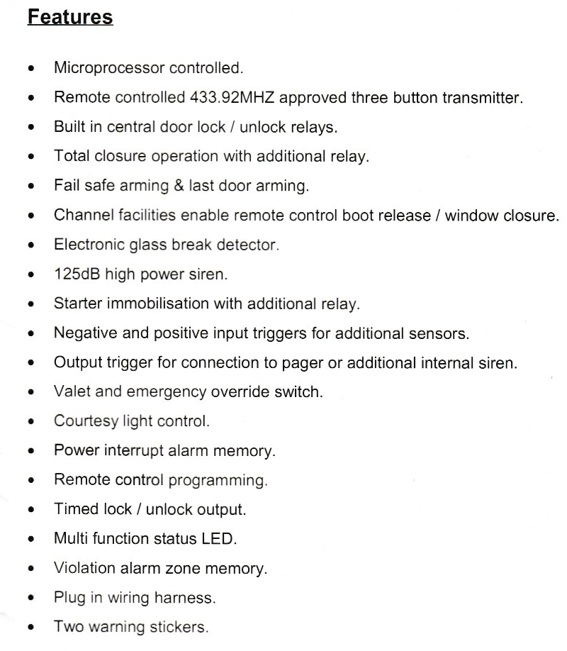 Avansert bilalarm med fjernkontroll styring. Innebygd styring av sentrallås, vindu og bagasjeluke. Leveres også med glassknusings detektor + mange andre funksjoner, (se vedleggs bilder).